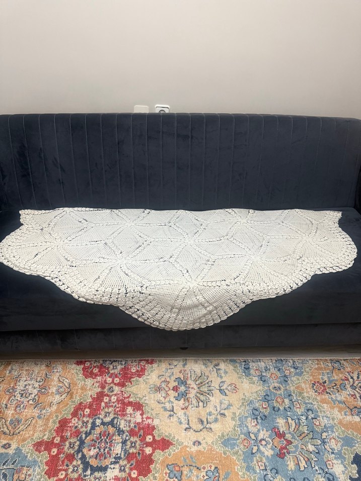 El işi beyaz örgü dantel örtü, karmaşık geometrik desenlere sahip, dekorunuza geleneksel bir dokunuş katmak için ideal.