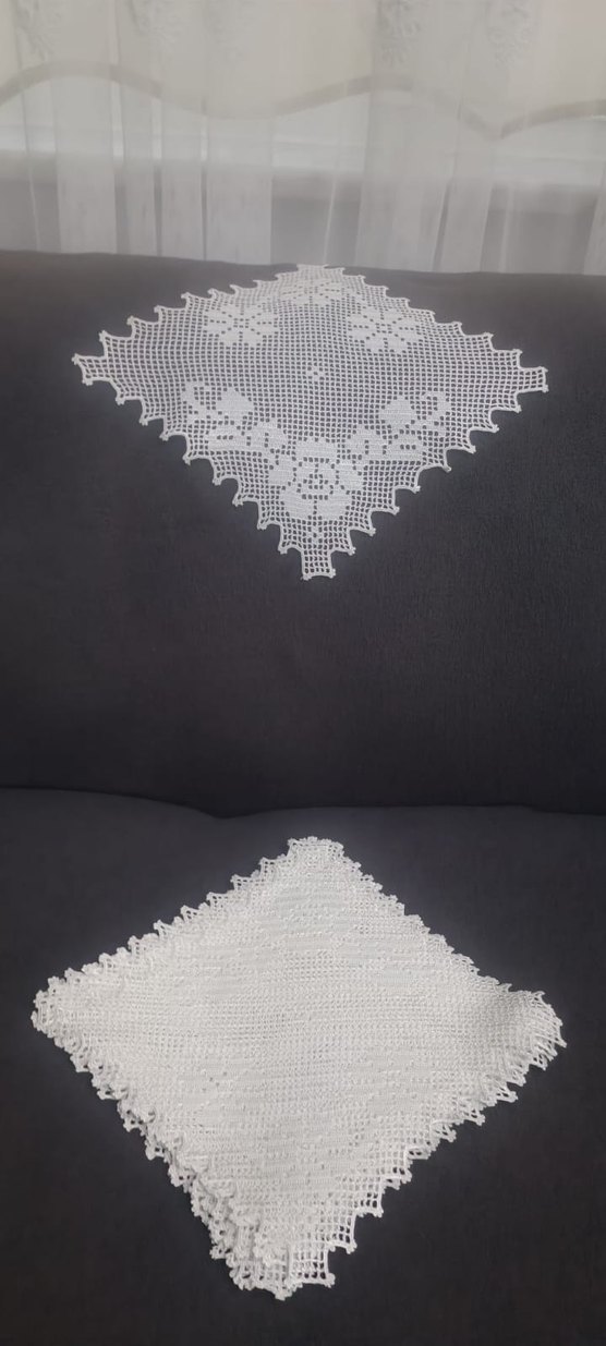 Çiçek ve geometrik desenlere sahip iki beyaz el işi örgü dantel takımı, dekoratif kullanım için uygundur.