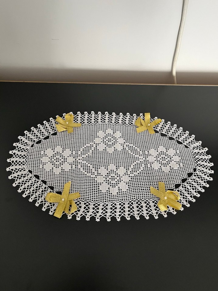 El işi beyaz dantel oval masa örtüsü, çiçek desenli ve kenarlarında sarı fiyonklarla süslenmiştir.
