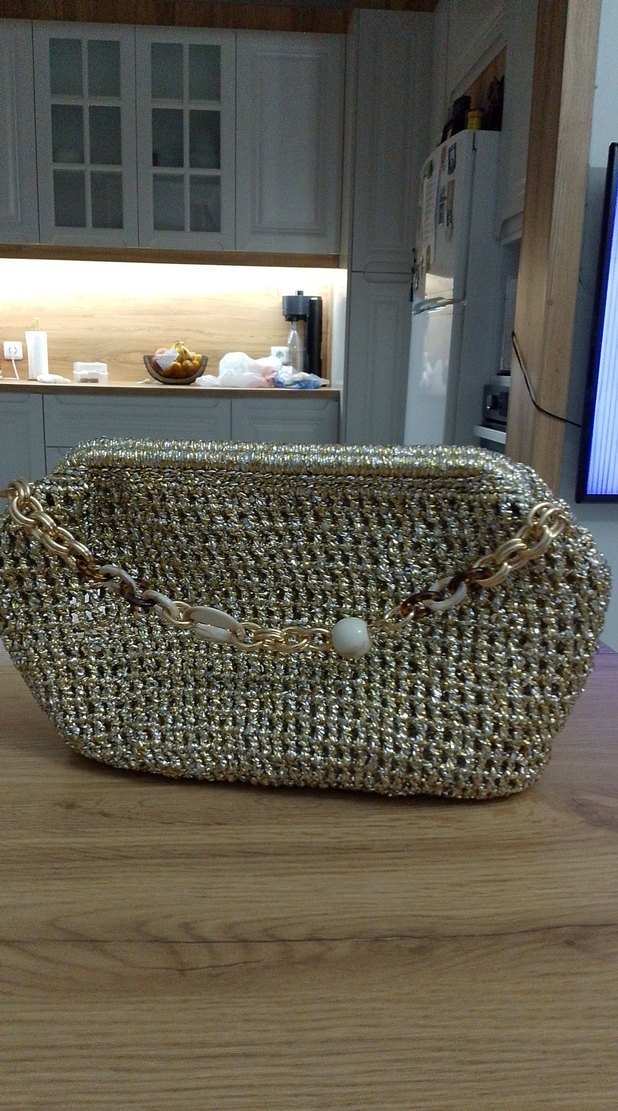 Kadınlar için el işi örgü ve parlak altın boncuklarla süslenmiş çanta. Zincir saplı, desensiz ve günlük kullanıma uygun bohem tarzda. ✨