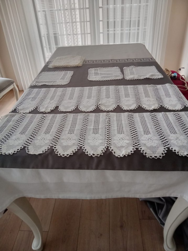 Takım 12 adet peçete, 2 uzun parça perdelik ve 2 tane buzdolabı örtüsü dantelden oluşmaktadır. 11 adet peçete kare şeklinde 23x23 ölçülerindedir. Bir tane büyük olan ürünün eni 30 cm boyu ise 28 cm. Perdeliklerin eni 100 cm boyu ise 28 cm dir. Ürünler hiç kullanılmamıştır.