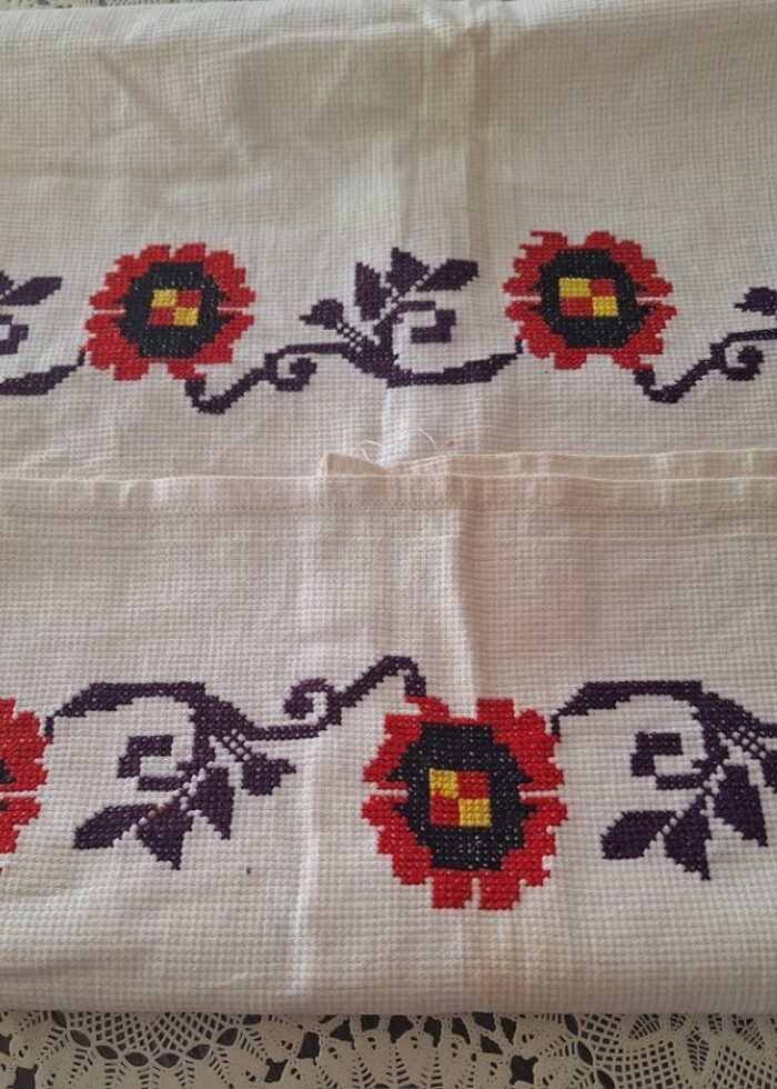 46 a 86 ölçülerinde el işi kanaviçe işlemesidir. Ürün hiç kullanılmadı. Fakat sandıkta uzun süre kaldığı için bazı bölgelerde sararma var.