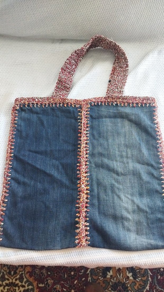 Bohem tarzda, kot kumaştan yapılmış, parlak çok renkli iple örülmüş kadın çantası. Günlük kullanıma uygun.