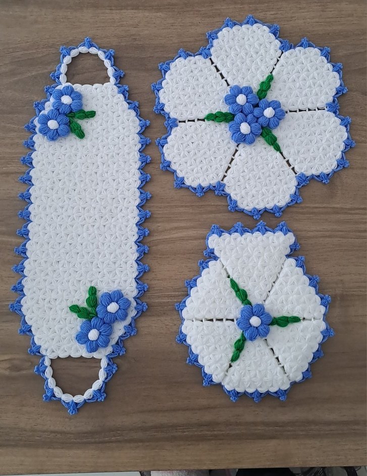 El işi beyaz tığ işi örtüler, mavi çiçek detaylı, saplı dikdörtgen ve iki yuvarlak parça, ev dekorasyonu için uygun.