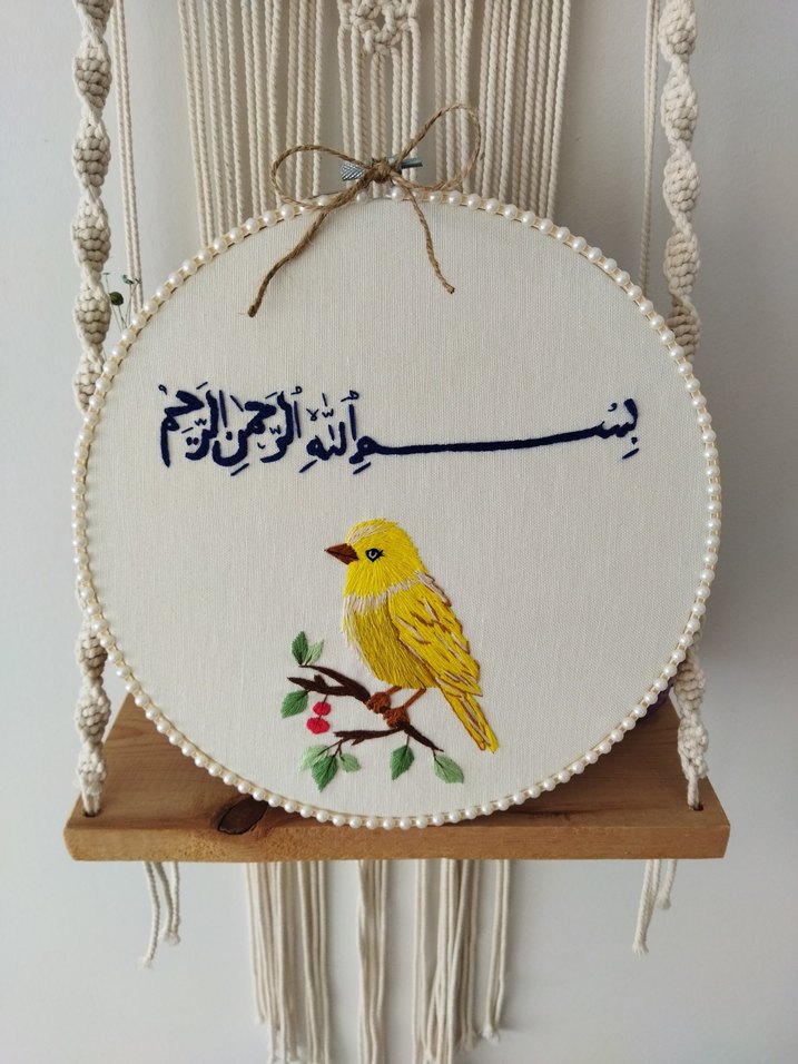 İnce boncuklarla çevrili, Arapça yazı ve sarı kuş nakışlı bohem tarzı el işi duvar süsü. ürün hazır değildir. instagramdan (limoncicegi_nakis) ulaşıp siparişinizi bitirdikten sonra buraya yüklediğimde satın alabilirsiniz.