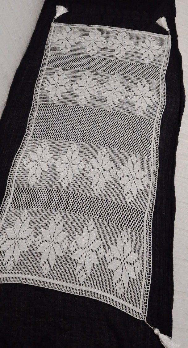 El işi örgü çiçek desenine sahip masa örtüsü, geleneksel tasarımıyla klasik bir görünüm sunar. eni 40 santim boyu 87 santim