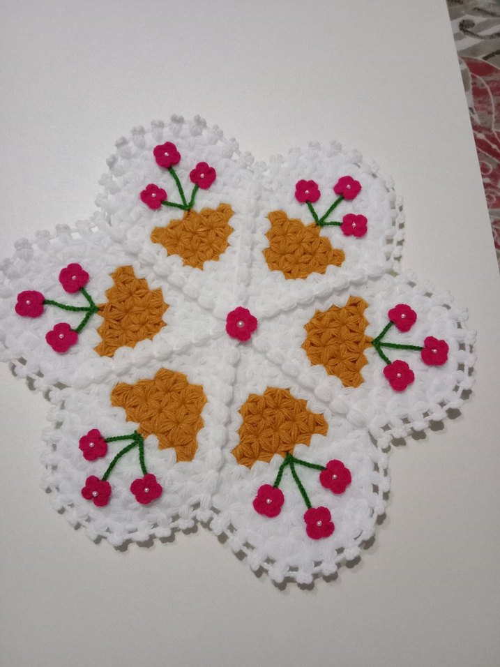 Beyaz tabanlı, hardal renkli merkezler ve küçük pembe çiçek detaylarına sahip el işi lif