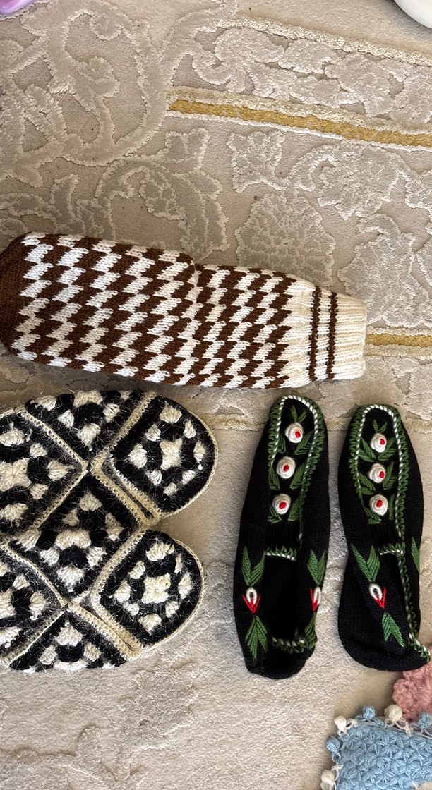 Bu set, siyah, beyaz ve kahverengi tonlarda geleneksel desenlerle el işi örme çorap ve terliklerden oluşur.