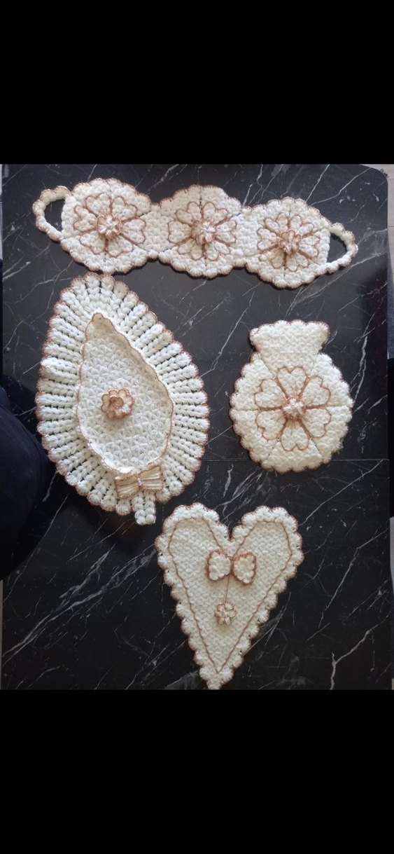 Yumuşak krem tonlarında çiçek desenli el işi örgü dekoratif set. Dekoratif kullanım için uygundur.
