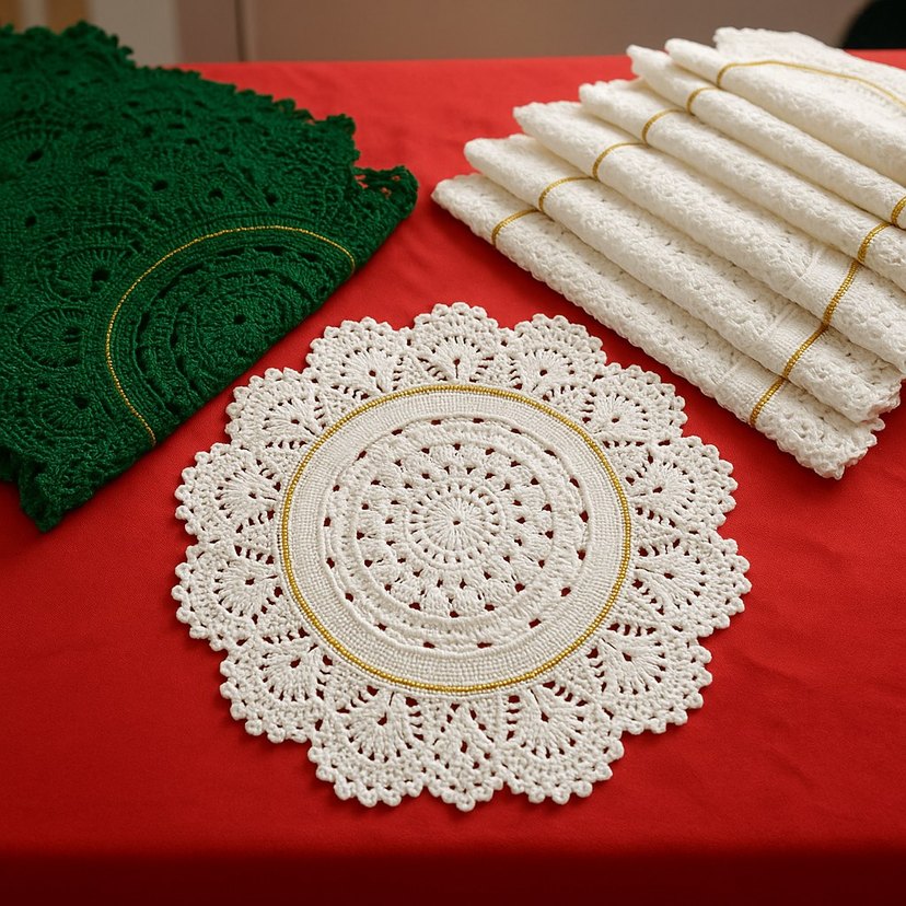 El işi yuvarlak örgü amerikan servisler, beyaz ve yeşil renklerde, sofranıza geleneksel bir dokunuş katar. Sıfır Yeni Örülmüştür