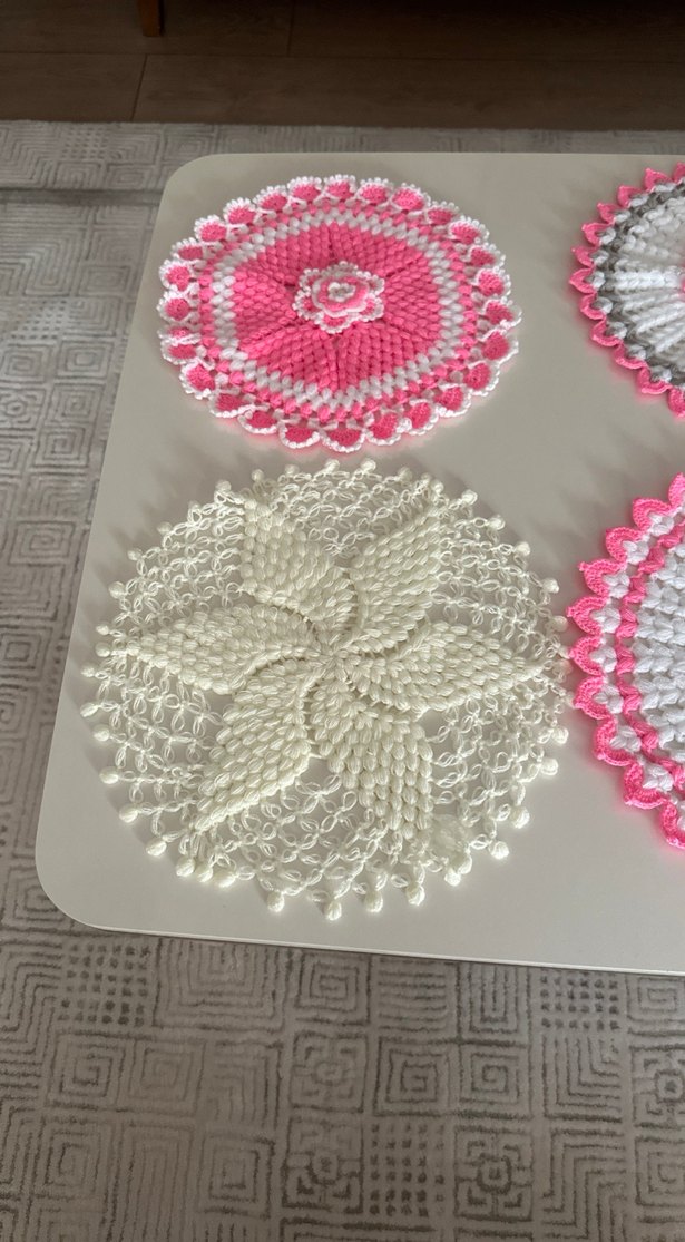 Beyaz ve pembe renkte el işi yuvarlak örgü motifler, detaylı desenler ve dokulu kenarlarla süslenmiştir.