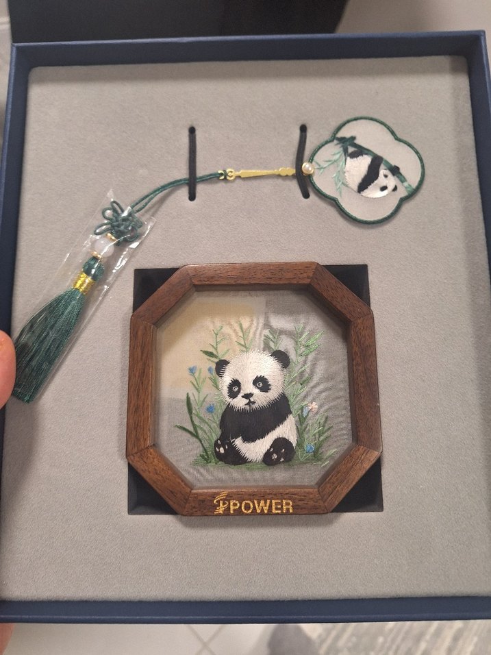 orijinal kutusunda çin shu sihuan Ahşap çerçeveli, yumuşak iplikle işlenmiş panda figürlü el işi set. WPOWER markalı püskül ve pandalı süs eşyası içerir.