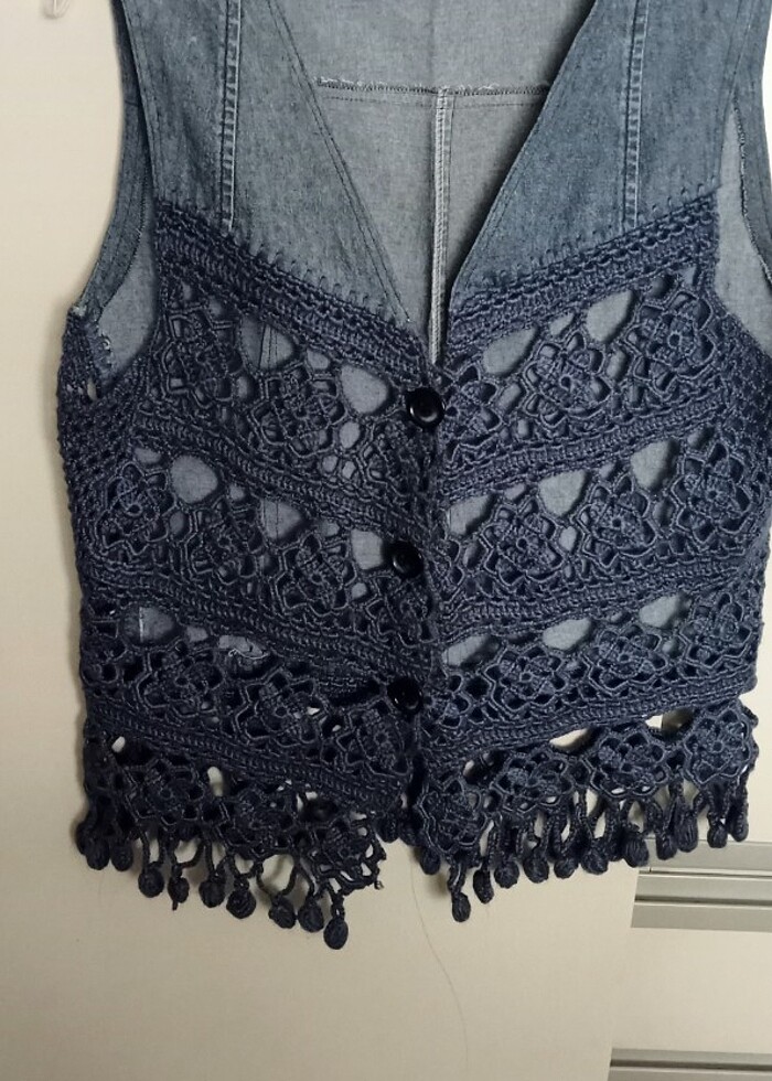 Kot kumaşla motifli etnik bir yelek duruşu cok güzel az giyildi tüylerme yok