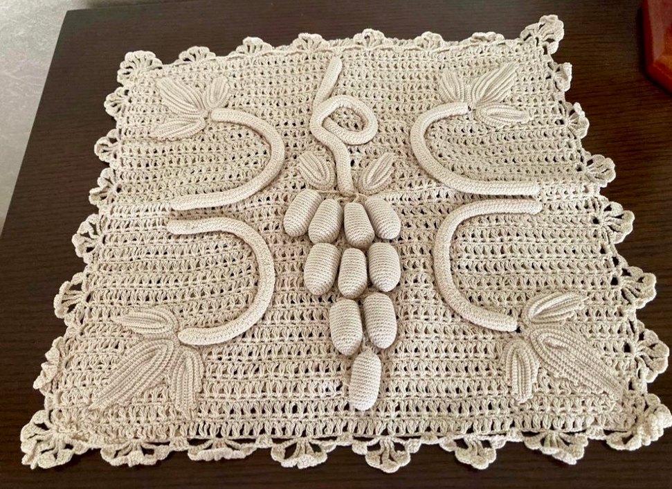 El işi üzümlü kırlent.Ürünün arkası dantel kafes yapılmış tır.