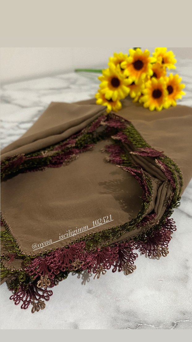 Kahverengi tekstil fular, koyu renkli dantel detaylarıyla bohem tarzını yansıtıyor. Retro ve hippie esintili, zarif dantel kenarları bulunur.