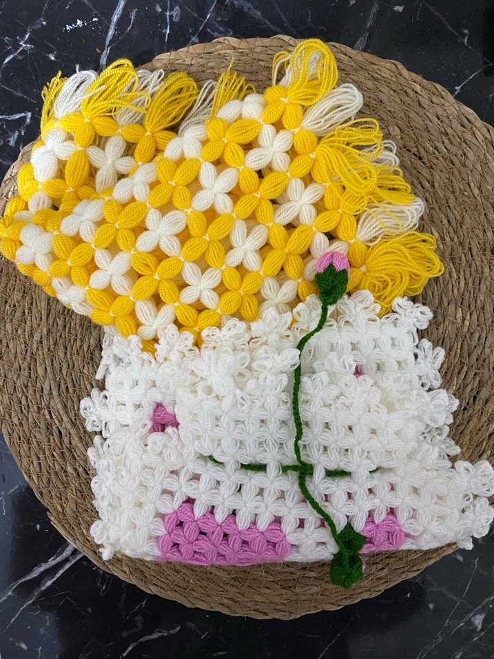 EL İŞİ Canlı sarı ve beyaz çiçek desenine sahip el yapımı bohem örgü sabun bezi, pembe ve yeşil detaylarla süslenmiştir. Yumuşak ve dokulu yapıya sahiptir. EL İŞİDİR