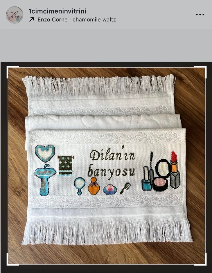 Beyaz mutfak havlusunda bohem tarzı nakışlı desenler ve püsküllü kenarlar bulunur, kozmetik temalı çizimler ve 'Dilan'ın banyosu' yazısı yer alır. Kişiye özel sipariş alınır.