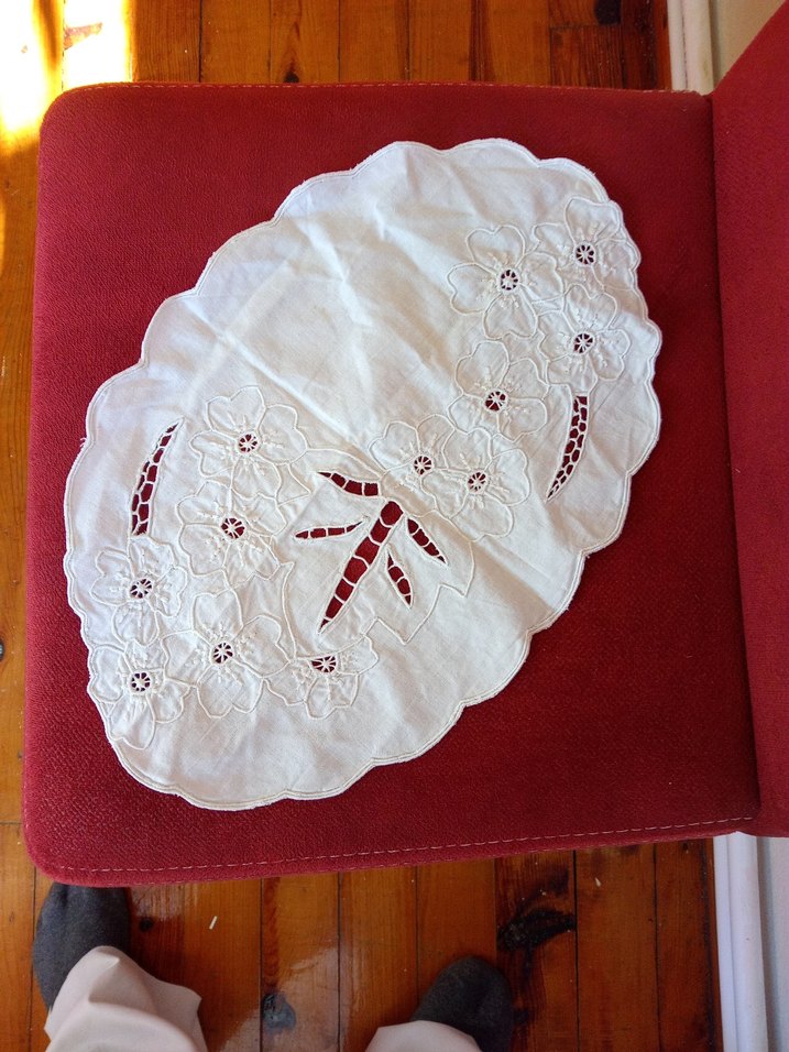 Çiçek işlemeli, dalgalı kenarlı beyaz delik isi tepsi örtüsü, ince el işiyle hazırlanmış. Delik işi makine nakisi