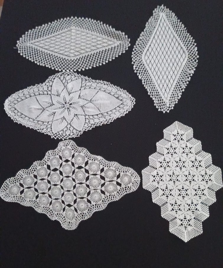 Beş adet beyaz el işçiliğiyle yapılmış dantel örtü, detaylı geleneksel desenlere sahip. Dantel tepsi örtüsü.. 1 tanesi şişle örülmüş .. 260 TL.