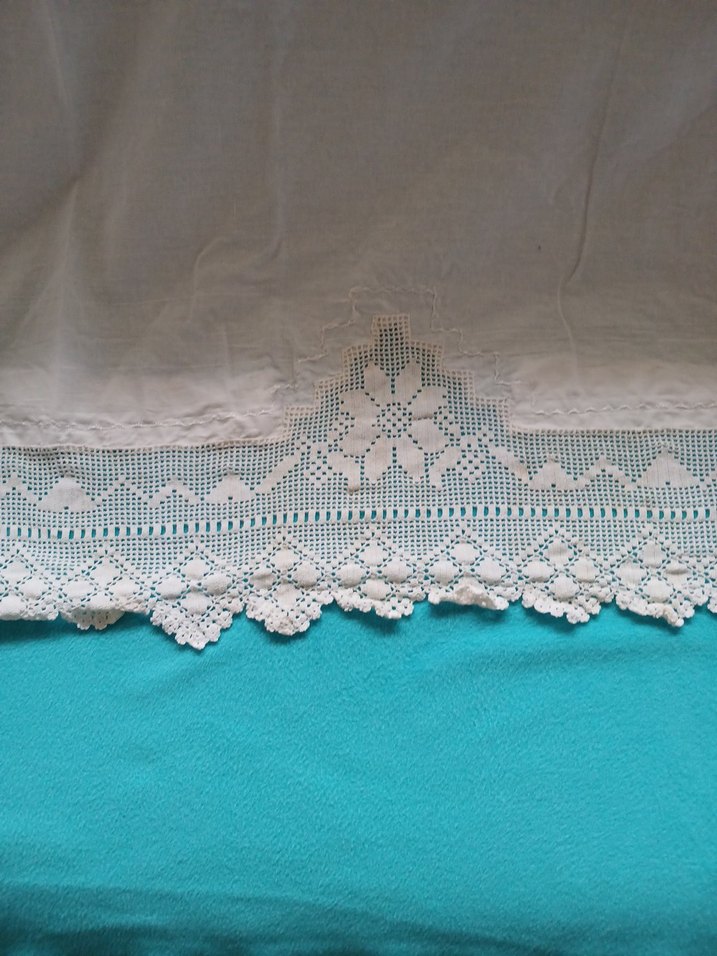 Çiçek ve geometrik desenlerle el işlemeli dantel kenarları bulunan beyaz kumaş, geleneksel tarzda..perde yada koltuk örtüsü olarak kullanılabilir. sandık lekeli. ölçüleri 200×90 cm