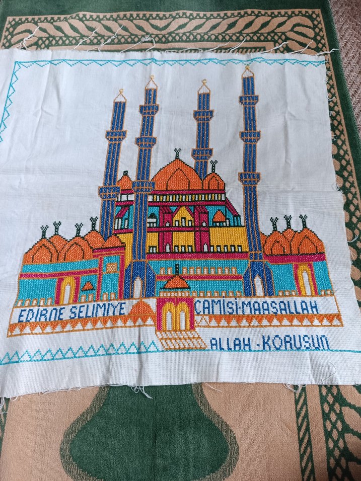 Beyaz kumaş üzerinde renkli nakışla işlenmiş Edirne Selimiye Camii motifi. "AMISI-MAASALLAH," "EDIBOE SELIMIYE" ve "ALLAH-KORUSUO" yazıları bulunmaktadır.
