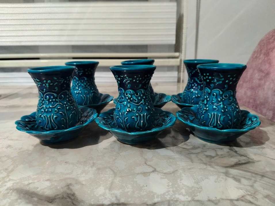 El işlemeli desenlere sahip koyu turkuaz kahve fincanları ve tabaklarından oluşan set, geleneksel kahve sunumu için uygundur. ☕