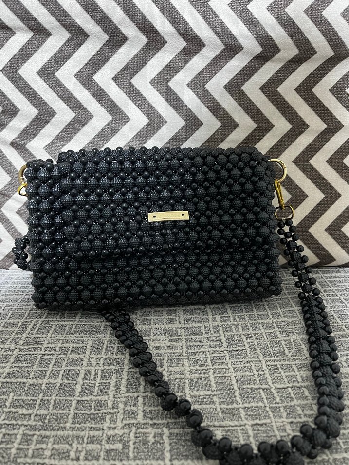 Siyah boncuklarla kaplı, sentetik kumaştan yapılmış kadın omuz çantasıdır. Zebra desenli arka planla, günlük kullanım için uygundur.