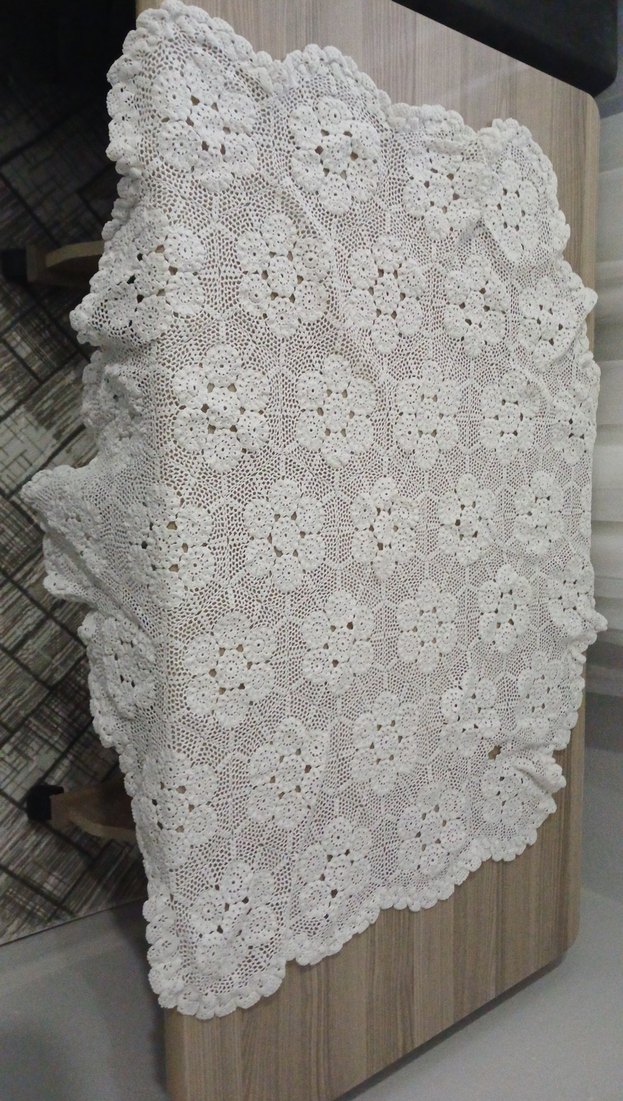 Beyaz dantel masa örtüsü, geleneksel tarzda çiçek desenleriyle el işi tığ işi detaylara sahiptir. Masanıza zarif bir dokunuş katar. minik defosu var