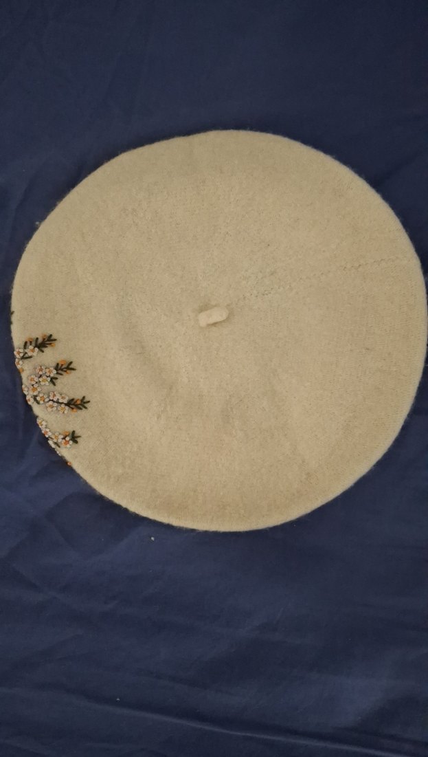 Yumuşak ve sıcak kumaştan yapılmış, boncuk işlemeli çiçek detaylarına sahip açık bej bohem Paris tarzı bere. ürün hiç kullanılmadı