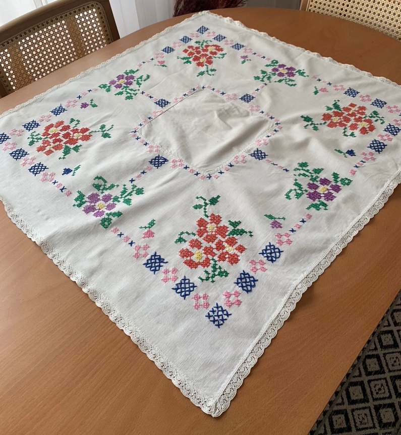 Beyaz kumaş üzerine işlenmiş çok renkli çiçek desenleri ve narin dantel kenarlığı olan Vintage tarzda masa örtüsü. Kare Pamuk Defosuz Beyaz