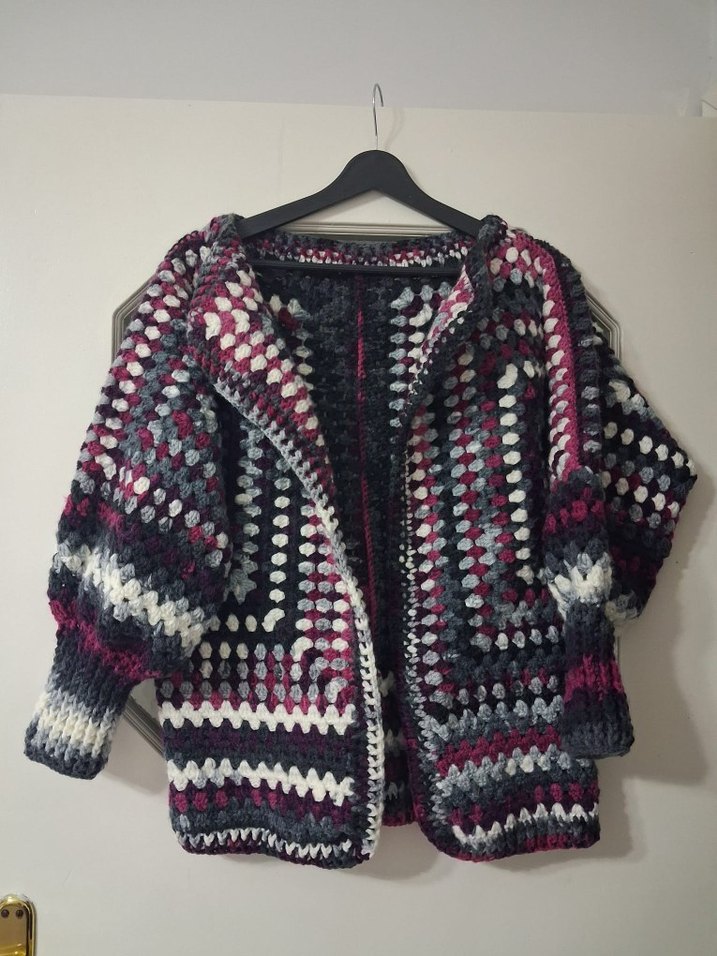 Bol kesim, midi uzunlukta, uzun kollu ve bisiklet yaka çok renkli desenli örgü hırka. Rahat ve bohem stil sunar, günlük kullanıma uygundur. 38 40 bedene rahatlıkla uyar