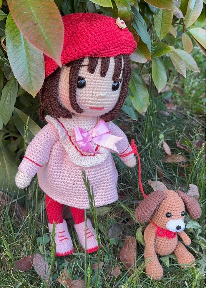 Özenle hazırlanmış el örgüsü Amigrumi sevimli bebek ve köpeği. Sıfır ürün.