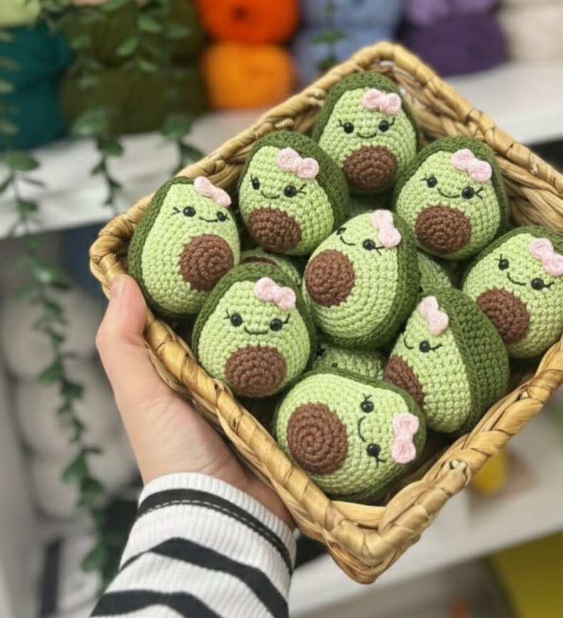 Yumuşak iplikle yapılmış, sevimli yüz detayları ve küçük fiyonklarla süslenmiş el örgüsü bohem avokado figürleri.