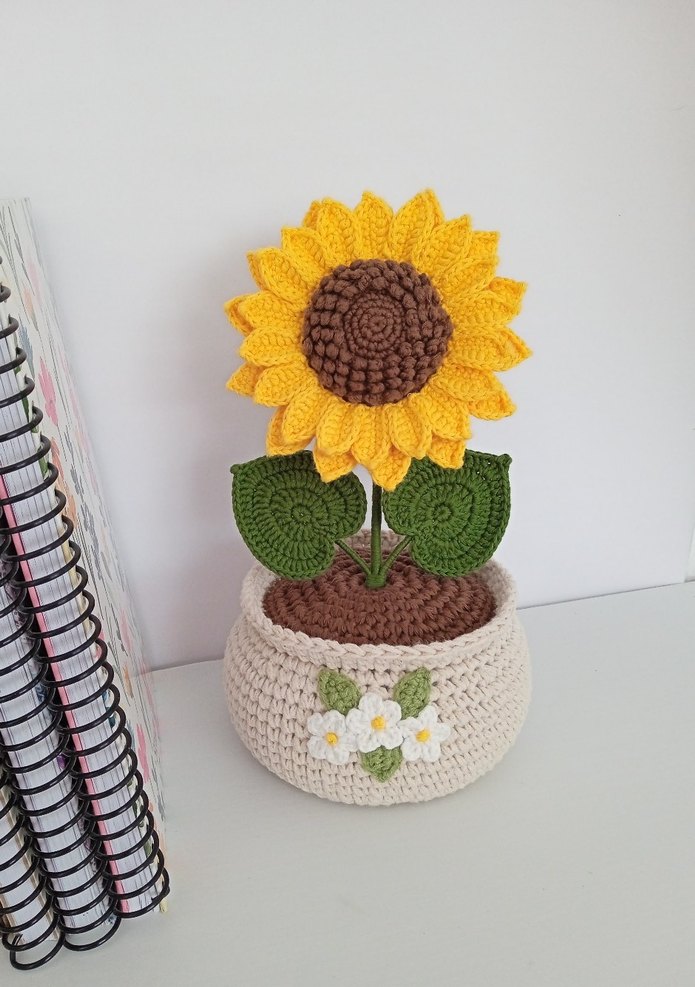 Koton iple örülmüştür. El örgüsü bohem tarzda ayçiçeği dekoru, çiçek detaylı örme saksı içinde. Canlı ve neşeli . Uzunluk 24 cm