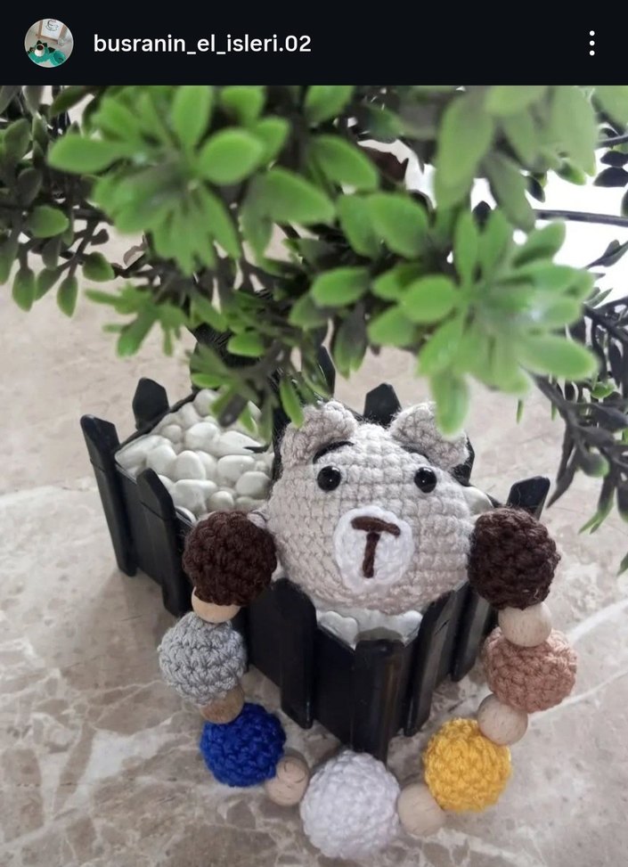 Gri ve kahverengi el örgüsü ayı figürlü peluş oyuncak, renkli örgü toplar ve ahşap boncuklarla süslenmiştir. Yumuşak ve dekoratif.