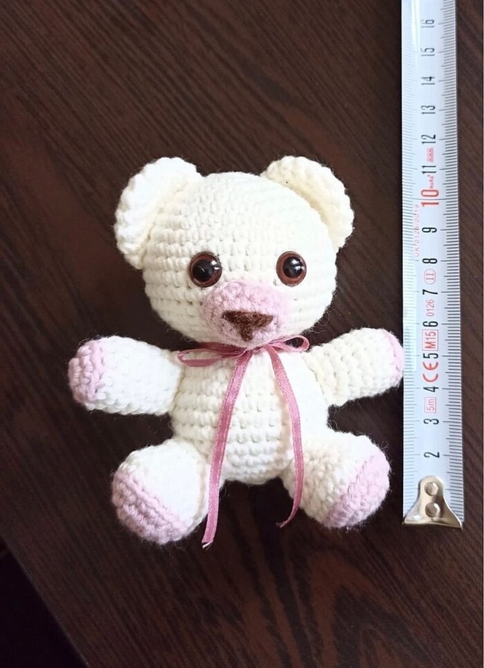 Pastel pembe detaylı, beyaz örgü peluş ayıcık. Boynu kurdeleli, yumuşak ve sevimli, yaklaşık 10 cm uzunluğunda. El örgüsü çanta çarmı