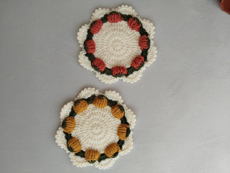 Krem, turuncu ve sarı renklerde bal kabağı desenli el örgüsü bardak altlıkları. Sonbahar sunumları için vazgeçilmez parçalar Belirtilen fiyat 2'li içindir.