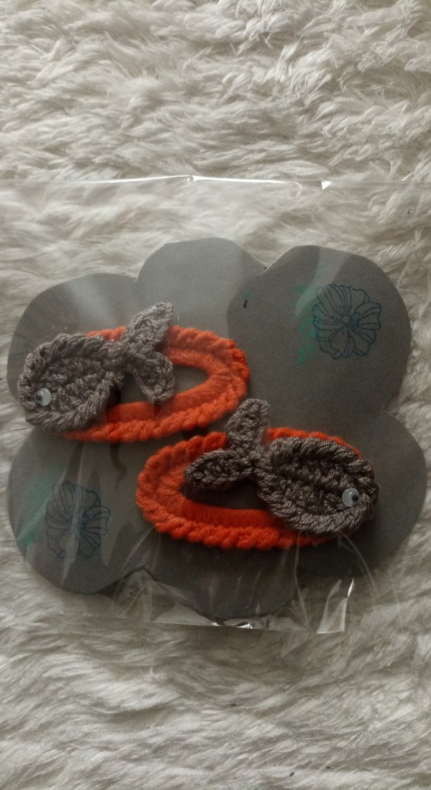 El örgüsü gri balık figürlü, canlı turuncu tabanlı çocuk saç tokaları, bohem tarzı için uygun.