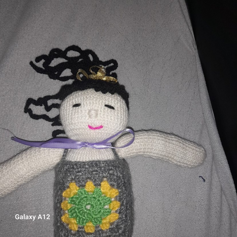 Gri renkte el örgüsü bebek, yeşil ve sarı detaylarla süslenmiş. Siyah ipten saçları ve küçük altın tacı var. Boynunda mor kurdele bulunur.