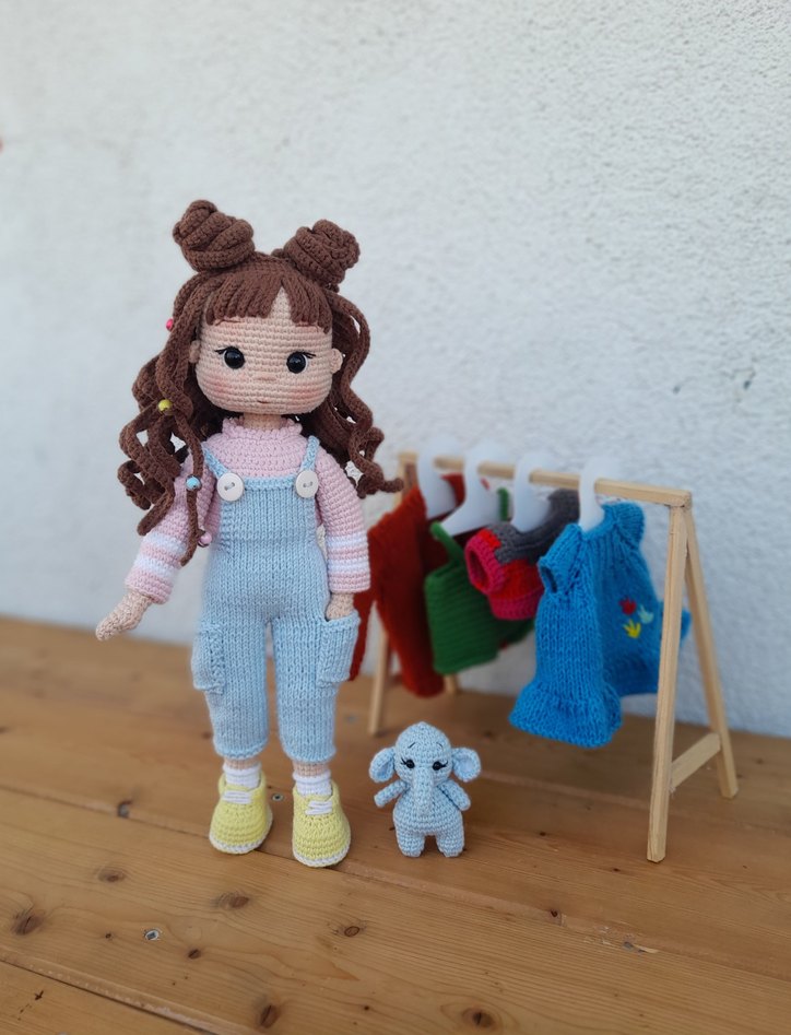 Pastel renklerde, kahverengi kıvırcık saçlı, açık mavi tulumlu ve sarı ayakkabılı el örgüsü gri bebek ile küçük bir fil oyuncak ve renkli örgü kıyafetler yer alıyor. Kollar hareketli