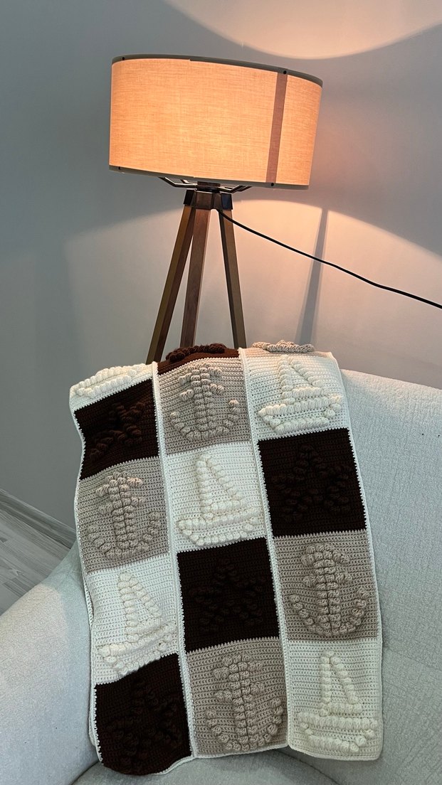 Açık bej renkli, örgü kumaştan yapılmış çocuk battaniyesi, kareli desenlerde kabartmalı yelkenli ve çapa figürleri içerir. Hatasız ve el örgüsüdür ölçü isteyiniz