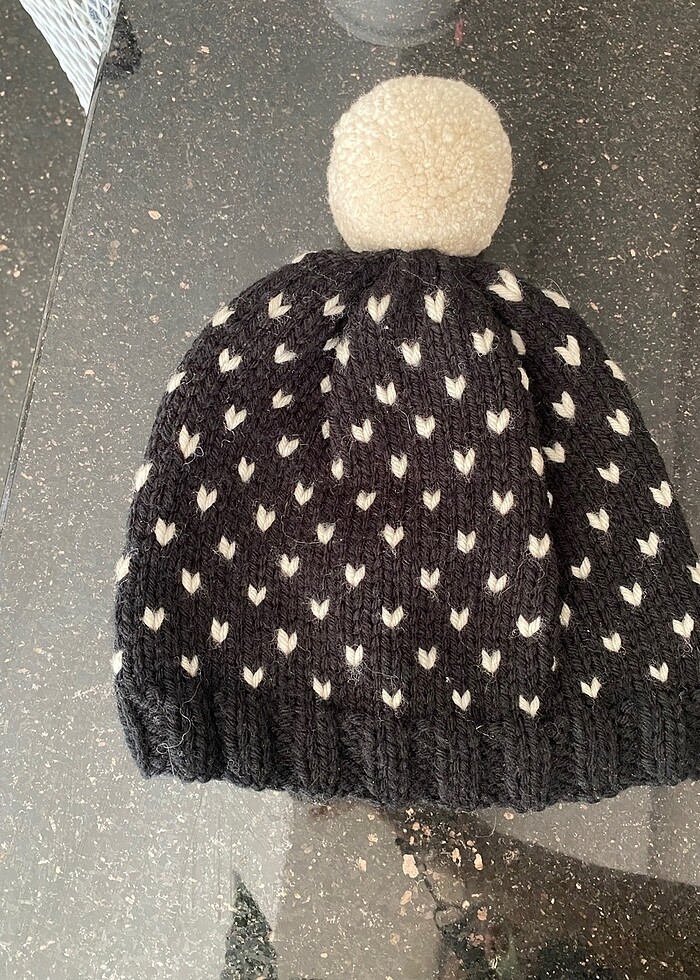 Rengi siyah, kalp deseni ve ponponu krem rengidir. Bir veya iki kez kullandım sadece