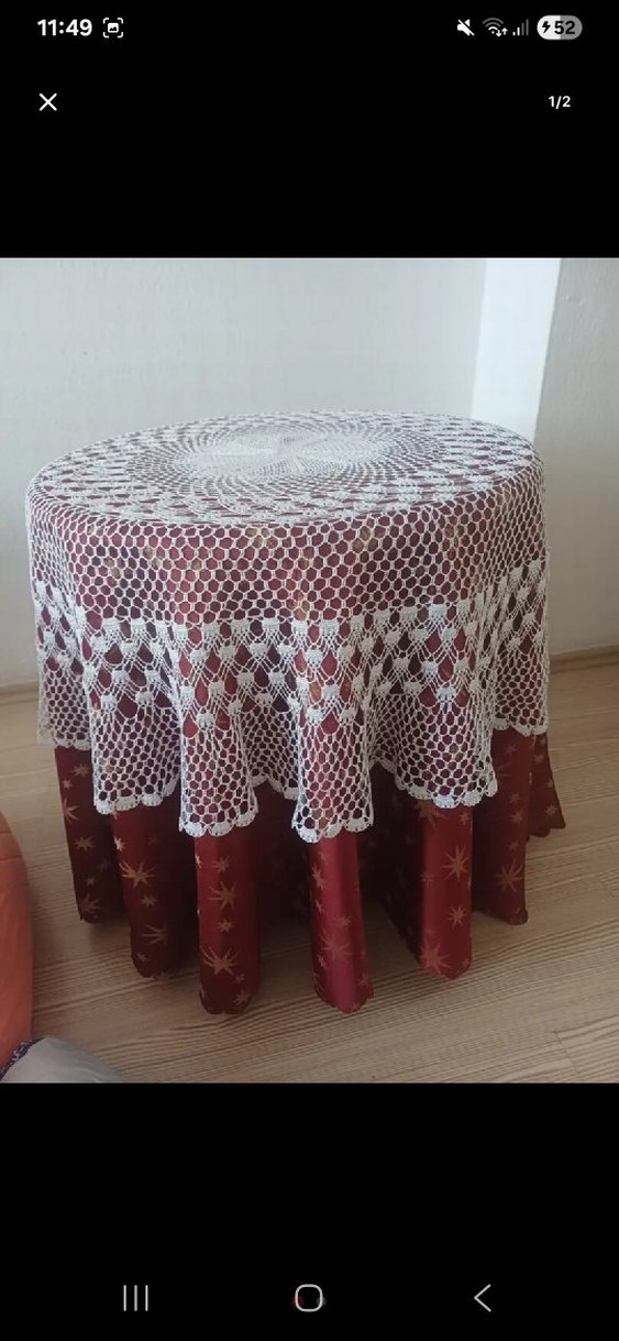 Yuvarlak masa için el örgüsü beyaz dantel masa örtüsü, detaylı desenlere sahip. Ev dekorasyonuna zarif bir dokunuş katıyor.