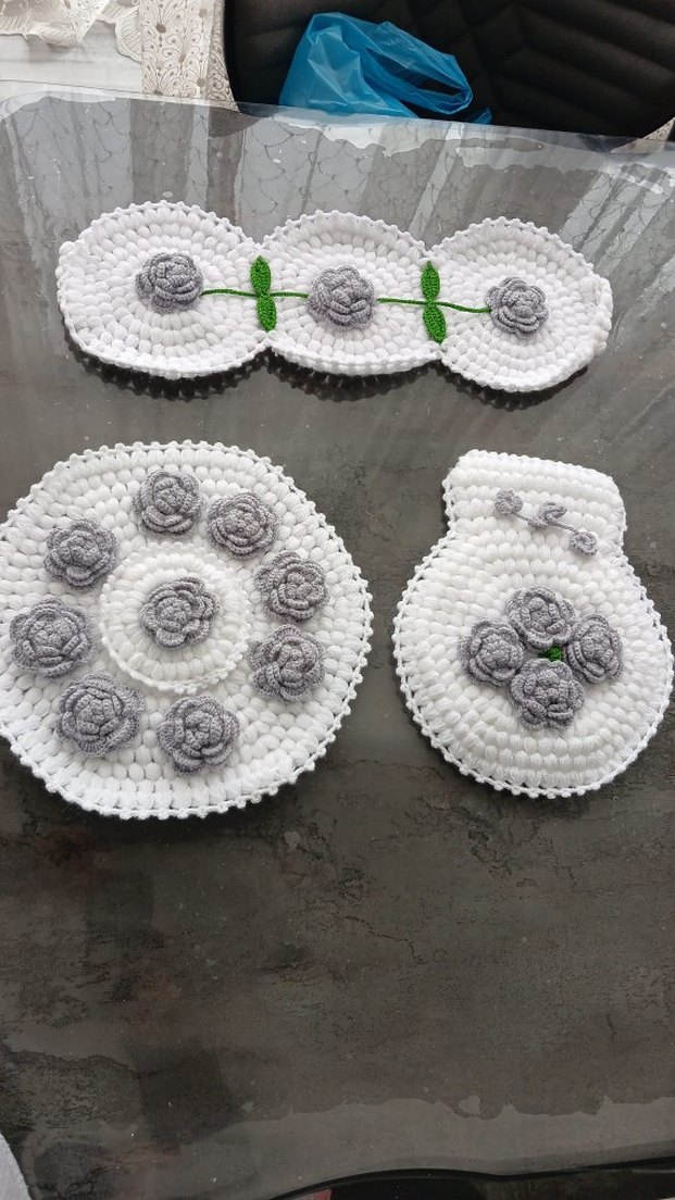El örgüsü beyaz dekoratif set, gri tığ işi çiçekler ve yeşil yaprak detayları ile yuvarlak ve oval parçalar içerir.