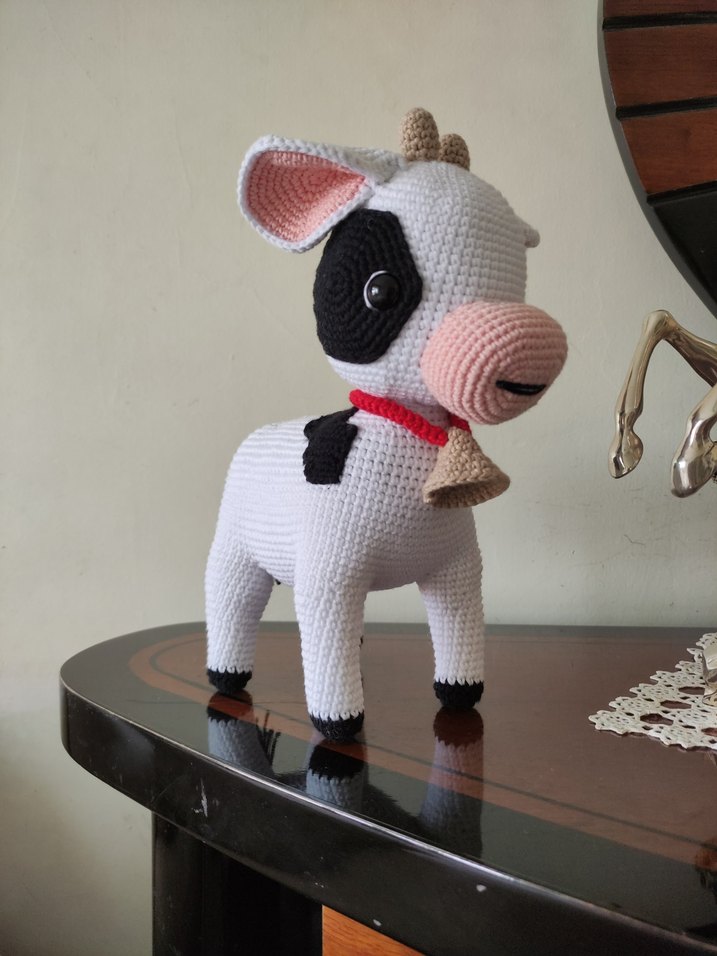 El örgüsü beyaz inek peluş oyuncak, gri ve siyah detaylar, kırmızı tasma ve küçük çan içerir. Yumuşak iplikten yapılmıştır.