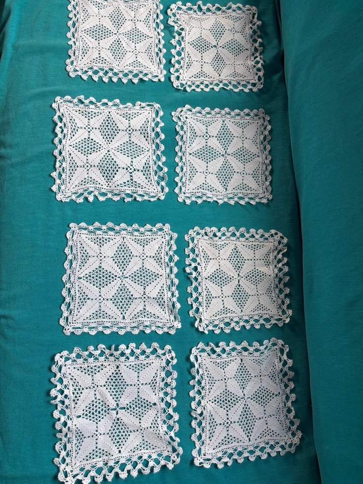 Geleneksel tarzda, ince desenli beyaz el örgüsü dantel motifler, dekoratif kullanım için uygundur.