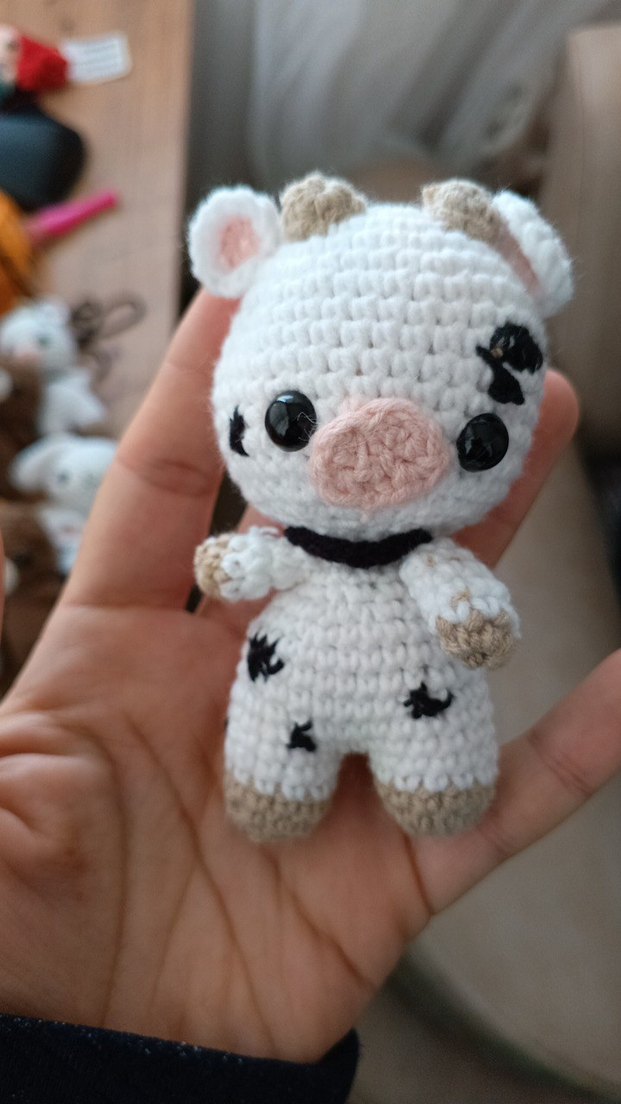 El örgüsü beyaz peluş oyuncak, açık kahverengi detaylar ve siyah gözlere sahip, küçük ve yumuşak tutuşlu. her modelden uygun fiyatlarla da yapılır