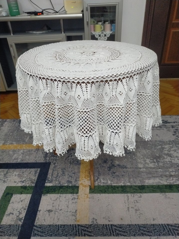 Beyaz yuvarlak masa örtüsü, ince el işi tığ işi desenlerle süslenmiş, masanıza geleneksel ve zarif bir dokunuş katıyor.
