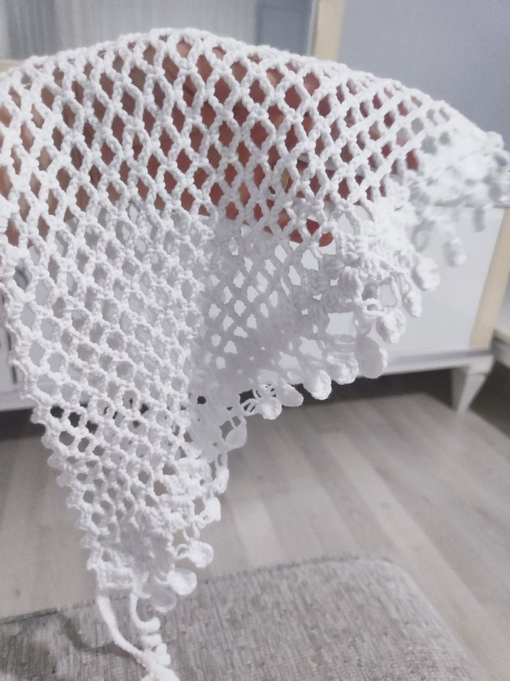 El yapımı beyaz dantel şal, bohem tarzda, açık örgü deseni ve püskül detaylarıyla. Yumuşak ve hafif kumaş.
