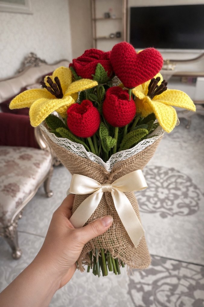 El örgüsü kırmızı ve sarı çiçeklerden oluşan bohem tarzda buket, rustik jüt ve saten kurdele ile sarılmış.